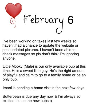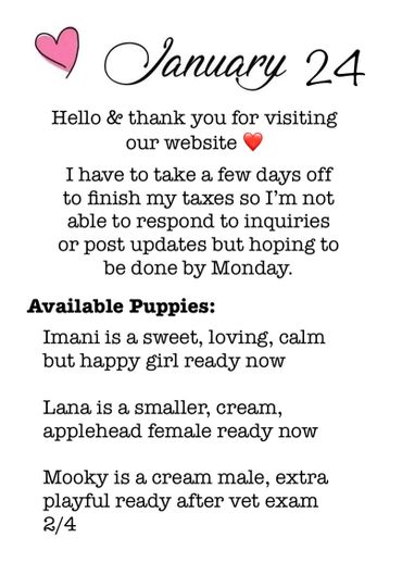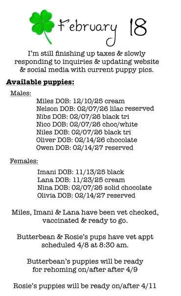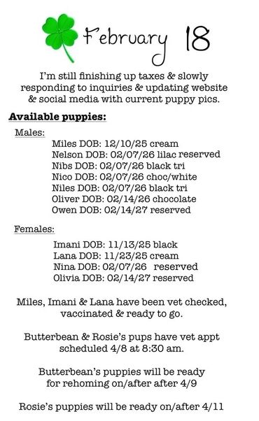 Sweet natured, playful puppies ready for family life. Puppies have been socialized for a wide range of family environments ~ interacting with older dogs, children, outdoors & Introduction to house training.